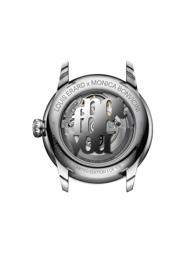 翻到背面,藍寶石水晶底蓋同樣以鏡面金屬刻出“not for you”,並鐫上「Louis Erard × Monica Bonvicini」與限量編號,全球限量178只,收藏意味強烈。腕錶配上兩種長度錶帶,佩戴起來毫無性別界線,正如藝術本就不該被定義。我喜歡這只錶的不討好姿態,既華麗又帶點搖滾氣息,卻像一面鏡子,逼人直視自我。對我而言,這不只是計時工具,而是戴在腕上的藝術品和宣言,正因如此,才更值得人們靠近思考,訂價TWD 180,000。