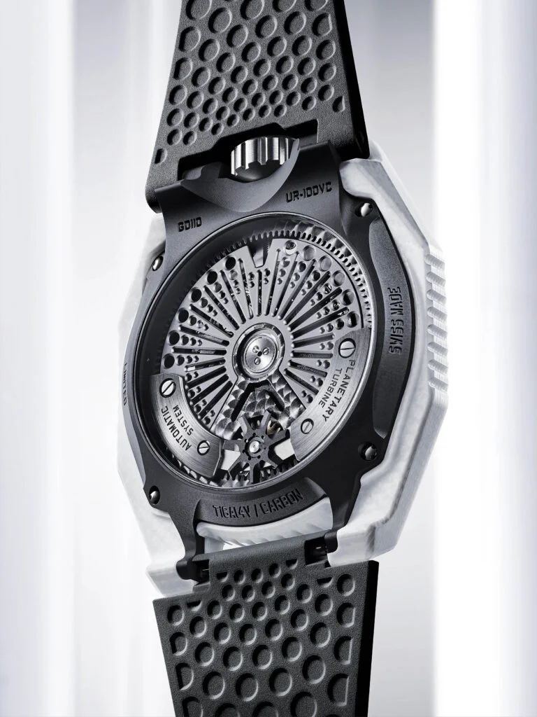 美學上,我非常欣賞這次的白陶瓷演繹。43毫米錶殼以特別研發的白色樹脂與銀色玻璃纖維構成,啞面質感在光線下呈現細膩層次,冷冽而純粹。翻到背面,DLC處理的5級鈦金屬底蓋下,是抽象太陽造型的自動盤,呼應整體天文主題。內部搭載UR-12.02自動機芯,配備雙發條盒與48小時動力儲存,更以扁平渦輪葉控制上鏈效率,避免過度上鏈帶來的壓力。鋁質衛星轉頭、鈹青銅日內瓦十字輪與ARCAP合金底板結構,互相配合支撐腕錶的精密運作,售價TWD 2,980,000。