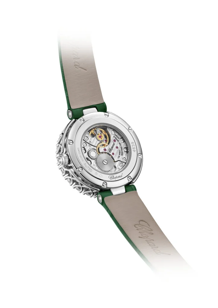 讓人著迷的,還有品牌最具代表性的創作Happy Sport系列腕錶。這款腕錶打破常規,把精鋼與鑽石結合,讓鑽石在兩層藍寶石水晶之間自由滑動。那種隨手腕律動而舞的光芒,既輕盈又自信。30毫米款式以玫瑰金與精鋼雙材質打造,比例優雅而不失活力。綠色鱷魚皮錶帶呼應春日主題,低調中見質感。腕錶的自動機芯提供約42小時動力儲存與30米防水性能,既有珠寶氣場,也能從容應對日常生活。