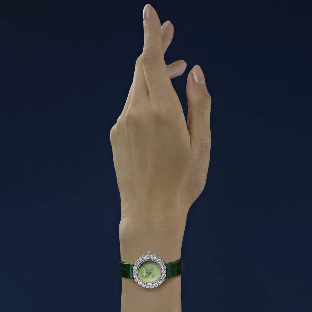 至於 L’Heure du Diamant,則把珠寶時計推向更華麗的層次。天然孔雀石錶盤鋪陳出獨一無二的紋理,綠色深淺交織,如春日大地的縮影,同時也是錶迷現在最喜愛的錶盤材質之一。細看錶圈環是鑲有圓形明亮式切割鑽石,再勾勒出花冠般的輪廓,整體鑲嵌約5.33克拉,光芒毫不含蓄,但33毫米尺寸仍保留恰到好處的優雅比例,在隆重與精巧之間取得平衡。