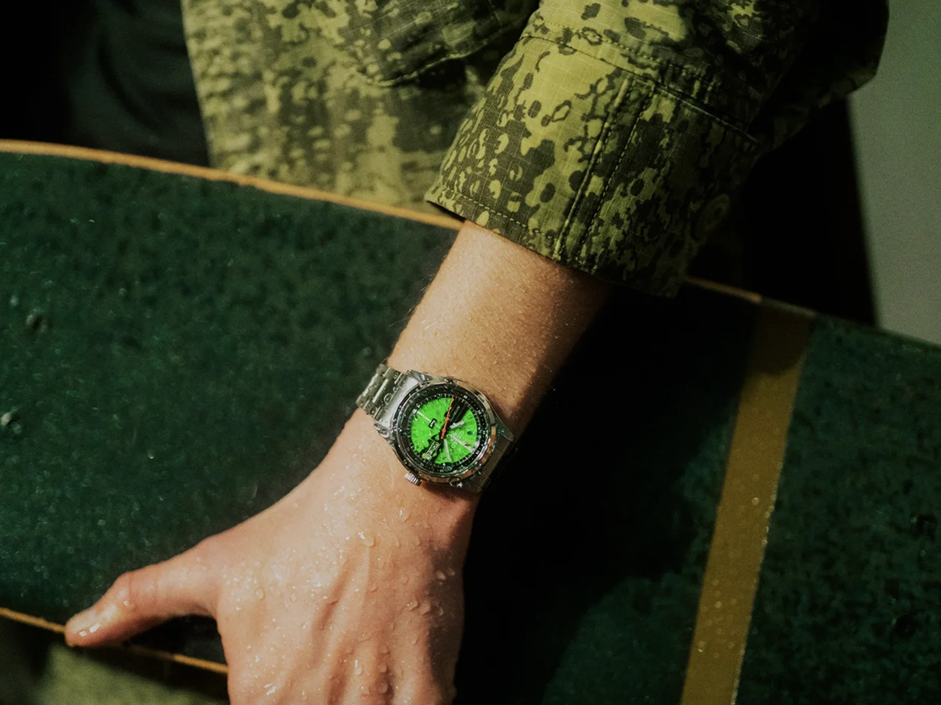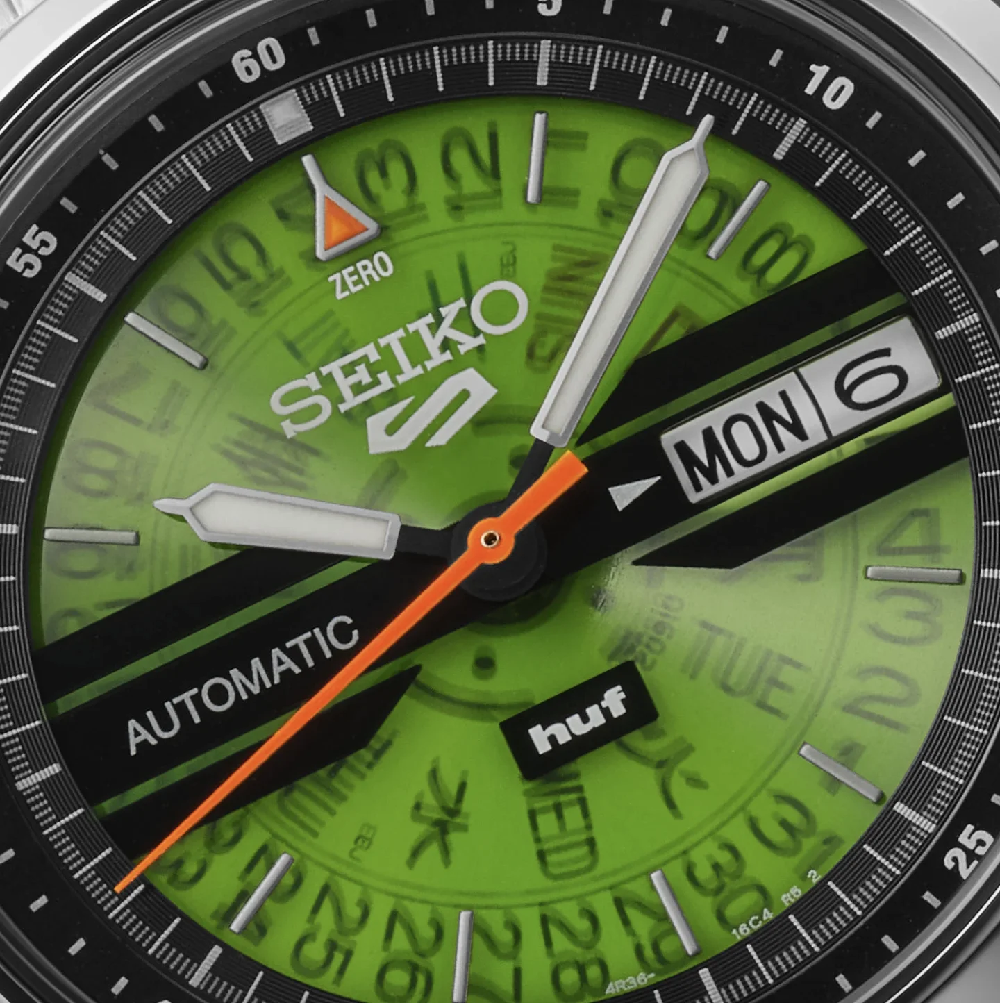 這兩位看似風格迥異的合作夥伴,其實早已多次擦出火花,包括SKX Diver Style和 5 Sports 1969等作品。今次聯乘以1970年代「Time Sonar」為藍本,把復古機械美學注入滑板與街頭文化語境。腕錶以Seiko 5 Sports Field系列為基礎,換上標誌性的「HUF 綠色」半透明錶盤,讓日曆盤與機芯結構若隱若現;6時位置印上簡潔「huf」標誌,橘色秒針配合夜光時標,對比強烈,營造出復古又帶點未來感的層次效果,遠遠一看已經夠矚目搶鏡。
