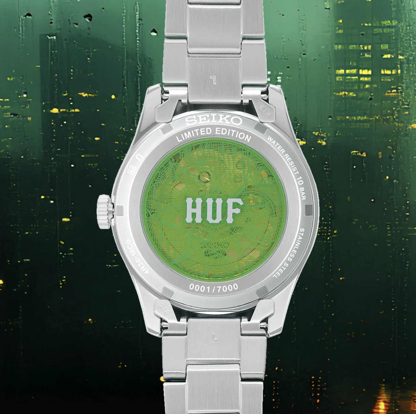 錶背同樣換上「HUF 綠色」,與錶盤前後呼應,並飾以品牌總部所在地的街道地圖,中央再點題放上HUF標誌,細節滿滿。錶冠亦刻上HUF 標誌,令整體聯乘語言一以貫之。腕錶直徑39.4毫米,搭載4R36自動機芯,約41小時動力儲存。全球限量7,000 枚,預計3月登場,對喜歡街頭文化又想試玩機械錶的玩家來說,絕對是不能錯過的一款。