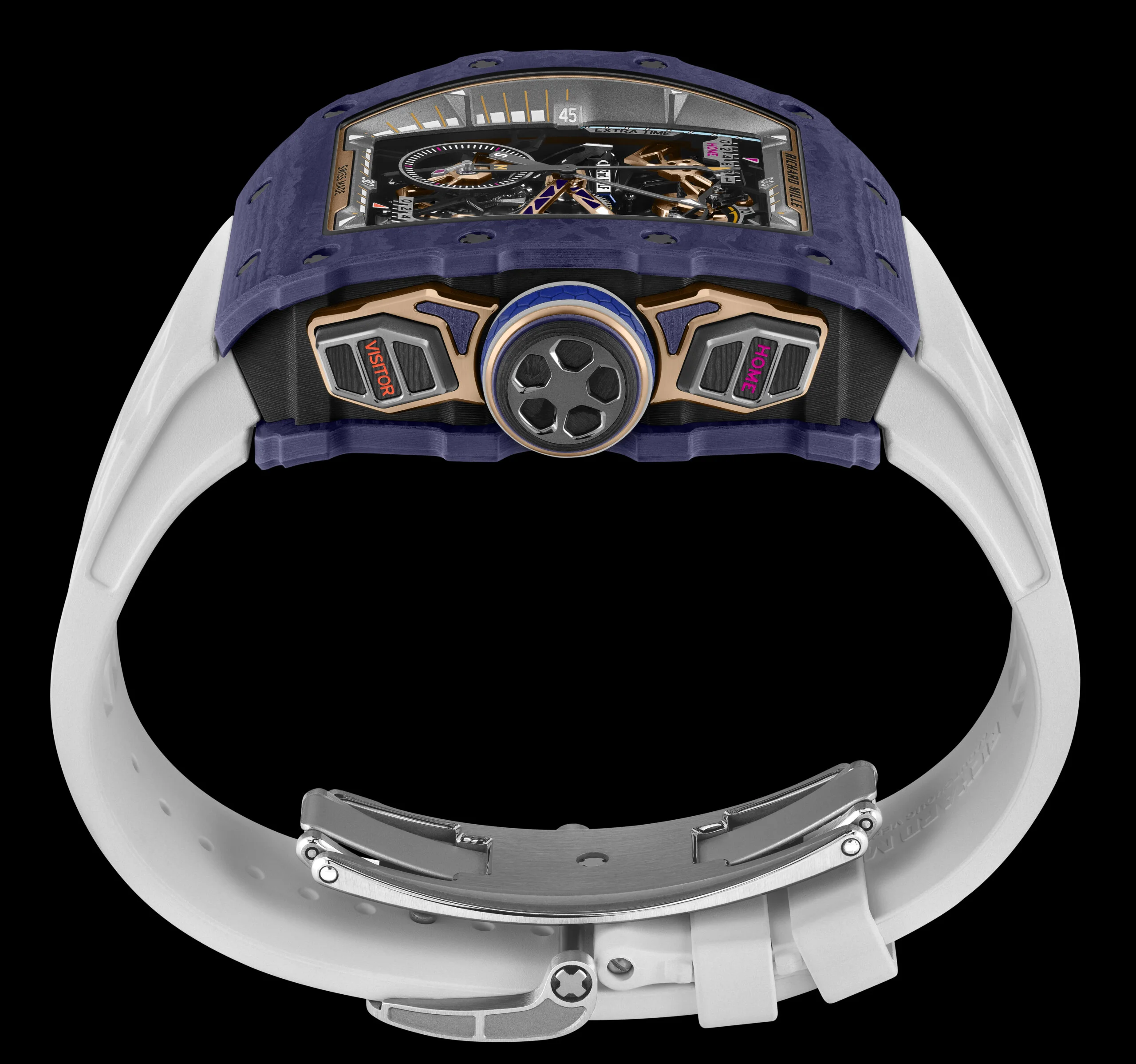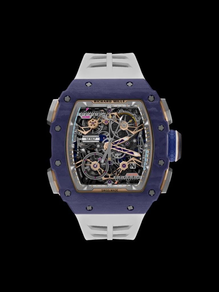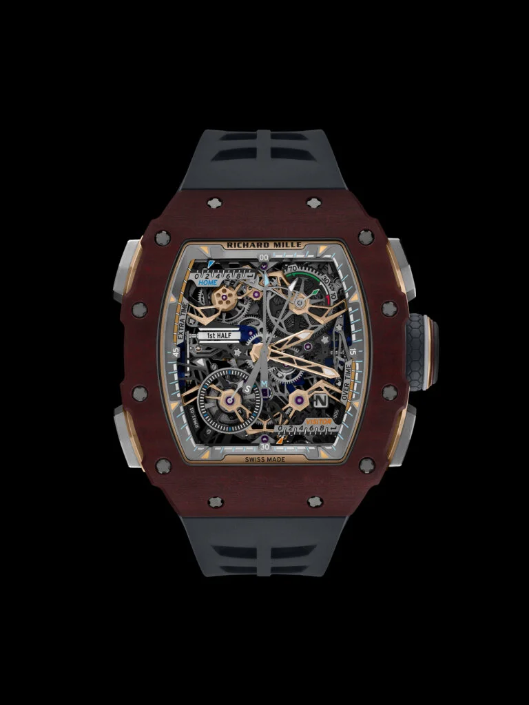 這枚全新專利陀飛輪飛返計時機芯歷經五年研發,由Richard Mille與Audemars Piguet Le Locle聯合開發。機芯採五級鈦合金製成,底板與橋板經高度鏤空處理,配備陀飛輪裝置、可同軸顯示分鐘與秒鐘的中央飛返計時功能,以及功能指示器。位於9時位置的比賽時間顯示器可即時追蹤賽事階段,每次重置飛返計時功能時,顯示器會從上半場切換至下半場,亦包括加時賽的兩個階段。此外,位於2時與4時方向的按鈕可分別記錄主隊與客隊的進球數。