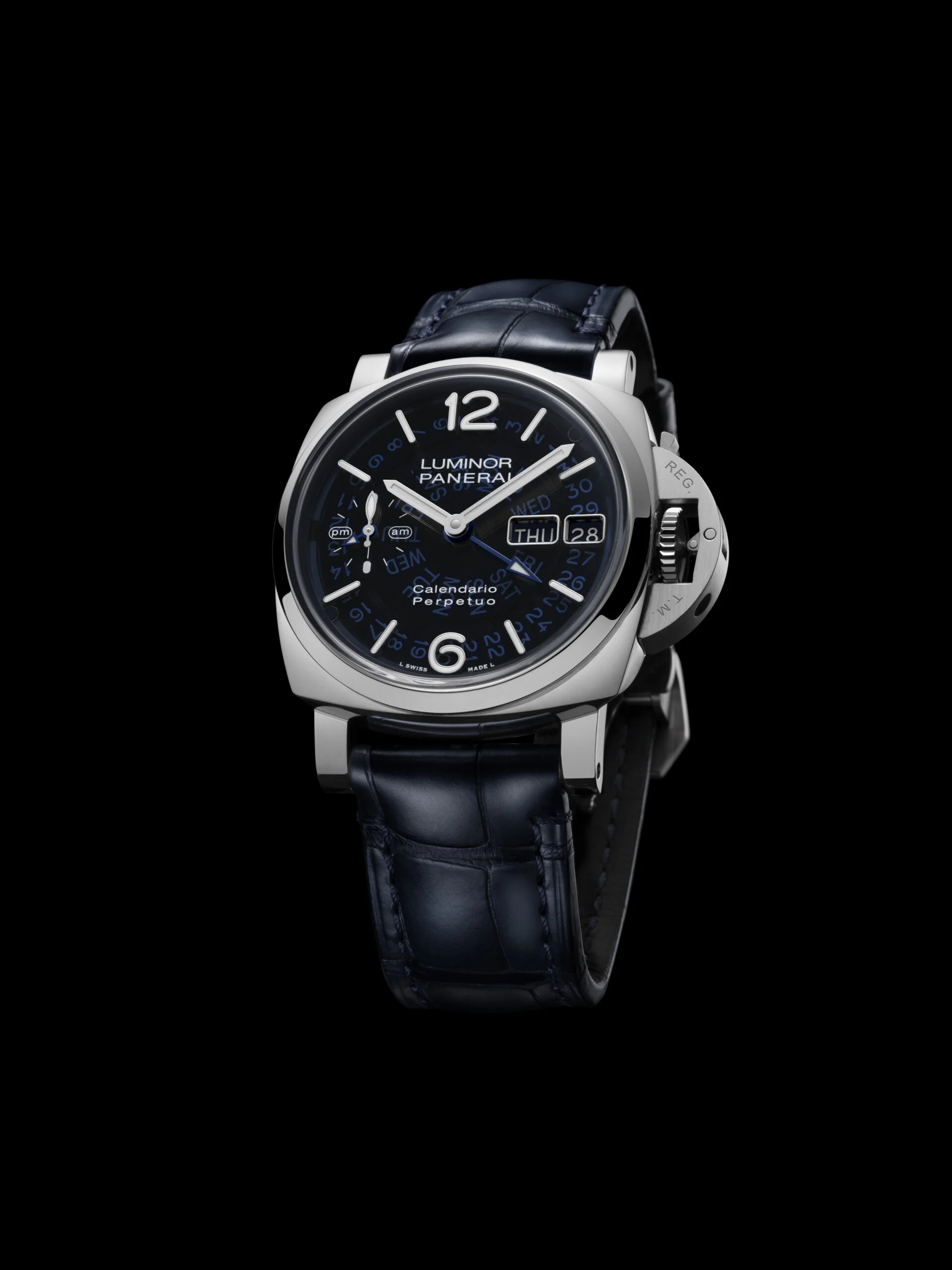 Luminor萬年曆兩地時Platinumtech腕錶PAM01575: 自家機芯以外,物料研發也是Panerai非常重視的一環。品牌專利的Platinumtech是一種由95%純鉑金製成的特殊合金,經獨特工藝處理,硬度比一般鉑金提高40%,具備更高的耐刮擦性。腕錶搭配P.4100萬年曆機芯,藍寶石水晶錶盤讓人能清晰看到萬年曆的日期和星期轉盤運作。