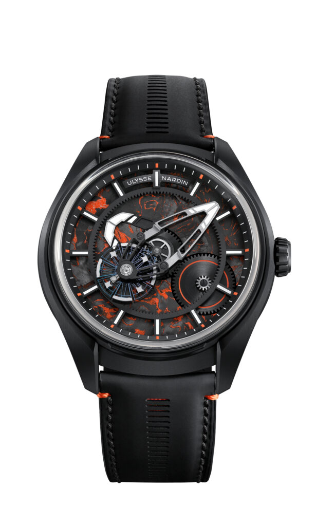 讀時方式則依舊保留Freak X標誌性機械結構,整枚機芯每小時旋轉一圈充當分鐘顯示,而12小時旋轉一圈的小時盤則負責指示小時。另一方面,飛行卡羅素取消上橋板支撐,懸浮感十足。分鐘輪首次加入橙色Super-LumiNova夜光圓環,搭配橋板與時標上的白色夜光細節,在昏暗環境下依然清晰銳利,視覺張力十足。腕錶內部搭載自家UN-230自動上鍊機芯,配備矽質擒縱系統,提供約72小時動力儲存。腕錶同時具備優異抗磁性能,黑色鏤空橡膠錶帶配橙色內嵌與縫線,進一步強化整體運動氣息,售價NTD1,318,000,限量150枚。