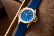最初看到這枚腕錶時,最吸引我目光的是錶殼採用近年很受歡迎的青銅材質。青銅經過垂直拉絲處理,再在邊緣倒角位置加上拋光修飾,整體質感相當細膩。而青銅最迷人的地方,在於隨著時間佩戴會慢慢氧化,逐漸形成屬於佩戴者自己的色澤與紋理,每一枚腕錶都會變得獨一無二。配合單向旋轉的青銅潛水錶圈與12點位置的夜光三角標記,也讓它在水下使用時更容易辨識。指針同樣值得細看,鑽石切割的鋼製指針覆以IP青銅色塗層,並塗上Super-LumiNova夜光塗料,在昏暗環境中依然清晰易讀。