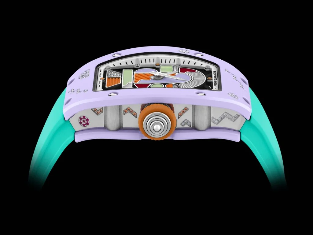 從2021年開始,RM 07-01便像是一個關於色彩、材質與結構的試驗,而來到這一代,我感受到的是一種收斂後的極致。特別是在寶石鑲嵌與彩色陶瓷的製作上,更見到品牌的成熟和精準。只要細心觀察,錶盤的表現非常強烈!灰色PVD紅金底板結合微米級修飾的彩色陶瓷,再加上雷射切割橡膠元素,讓整體視覺在工業感與裝飾性之間取得微妙平衡。特別是璣鏤刻花的運用,讓光線在不同角度下產生流動,這種動態的精緻,正是我認為新腕錶最迷人的地方。