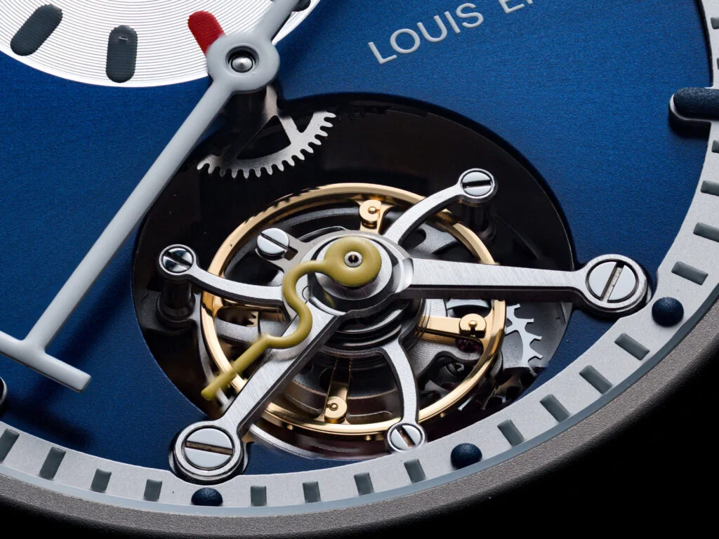 而當我把目光轉向Régulateur Tourbillon Blue,整個氛圍再轉到另一個層次。6點鐘位置的陀飛輪裝置,由La Chaux-de-Fonds的製錶師Olivier Mory專門開發,結構開放且層次分明。規範式指針布局讓時間顯示回歸理性,中央分鐘、小時獨立於12點位置,清晰而專注。40mm微噴砂鈦金屬錶殼搭配尼龍魔鬼氈錶帶,輕盈、貼合,而且沒有傳統錶扣的束縛。這種設計其實非常現代,並減少多餘結構,把舒適與實用性放在最重要的位置,訂價NT739,800。