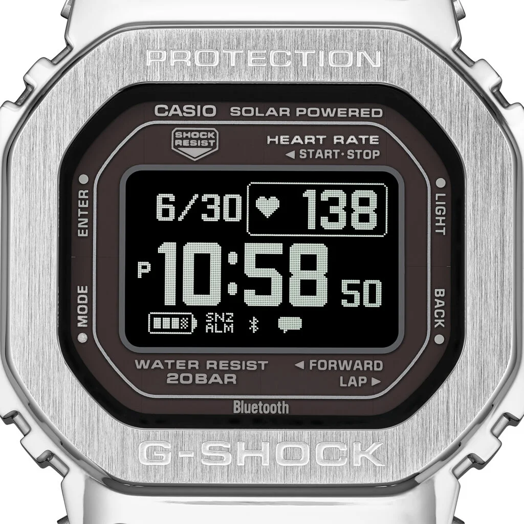 GM-H5600換上了不鏽鋼金屬錶圈,並提供金色與銀色兩種選擇,搭配生質樹脂錶帶與碳纖維強化樹脂錶背,在重量與耐用度之間取得不錯的平衡。特別是錶圈四角的機械加工孔位設計,讓整體視覺多了一點科技裝備的味道,也讓這只腕錶開始講究風格。不過,真正讓我覺得有意思的,還是內在的功能配置,包括光學心率感應器與步數偵測功能,並支援跑步、步行、健身與間歇訓練等模式。歸納來說,就是一只擁有G-SHOCK帥氣外表的智能腕錶!