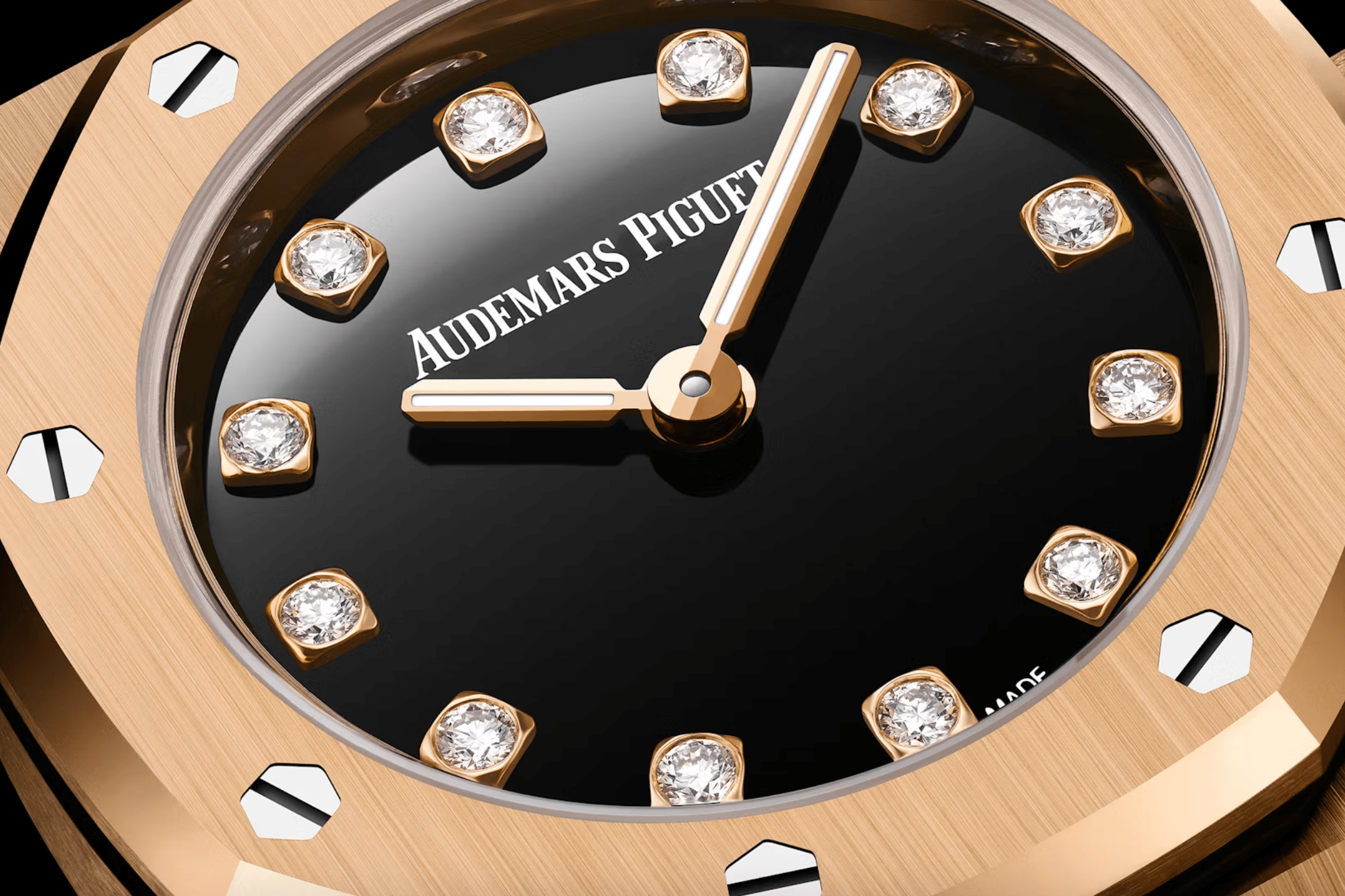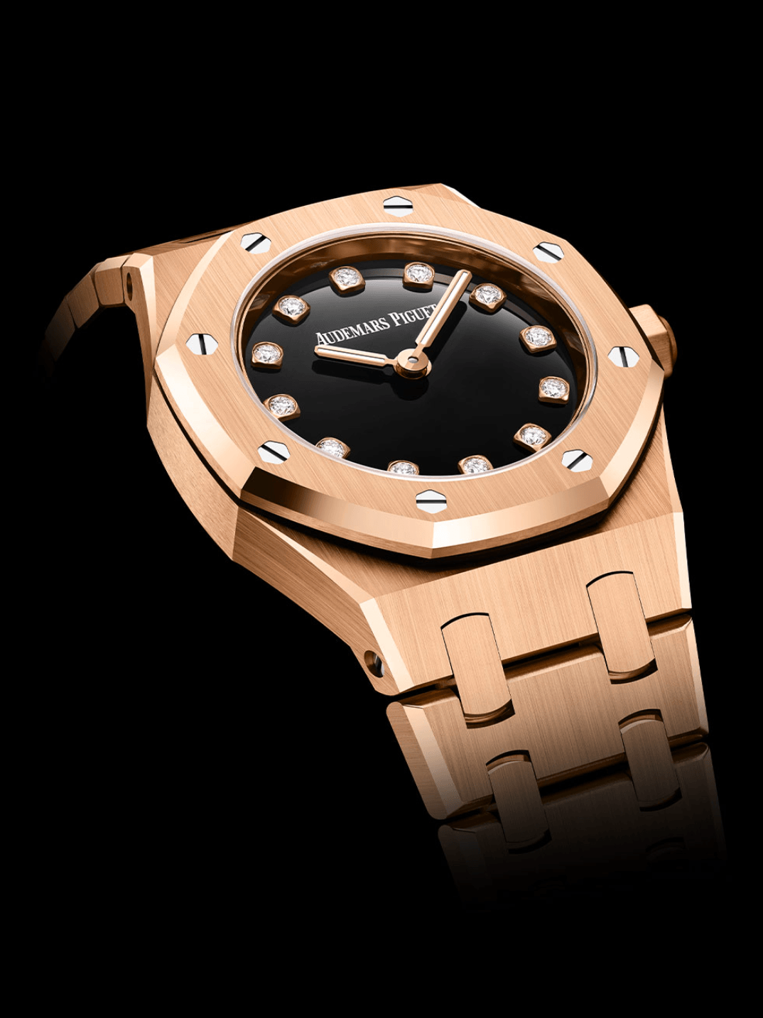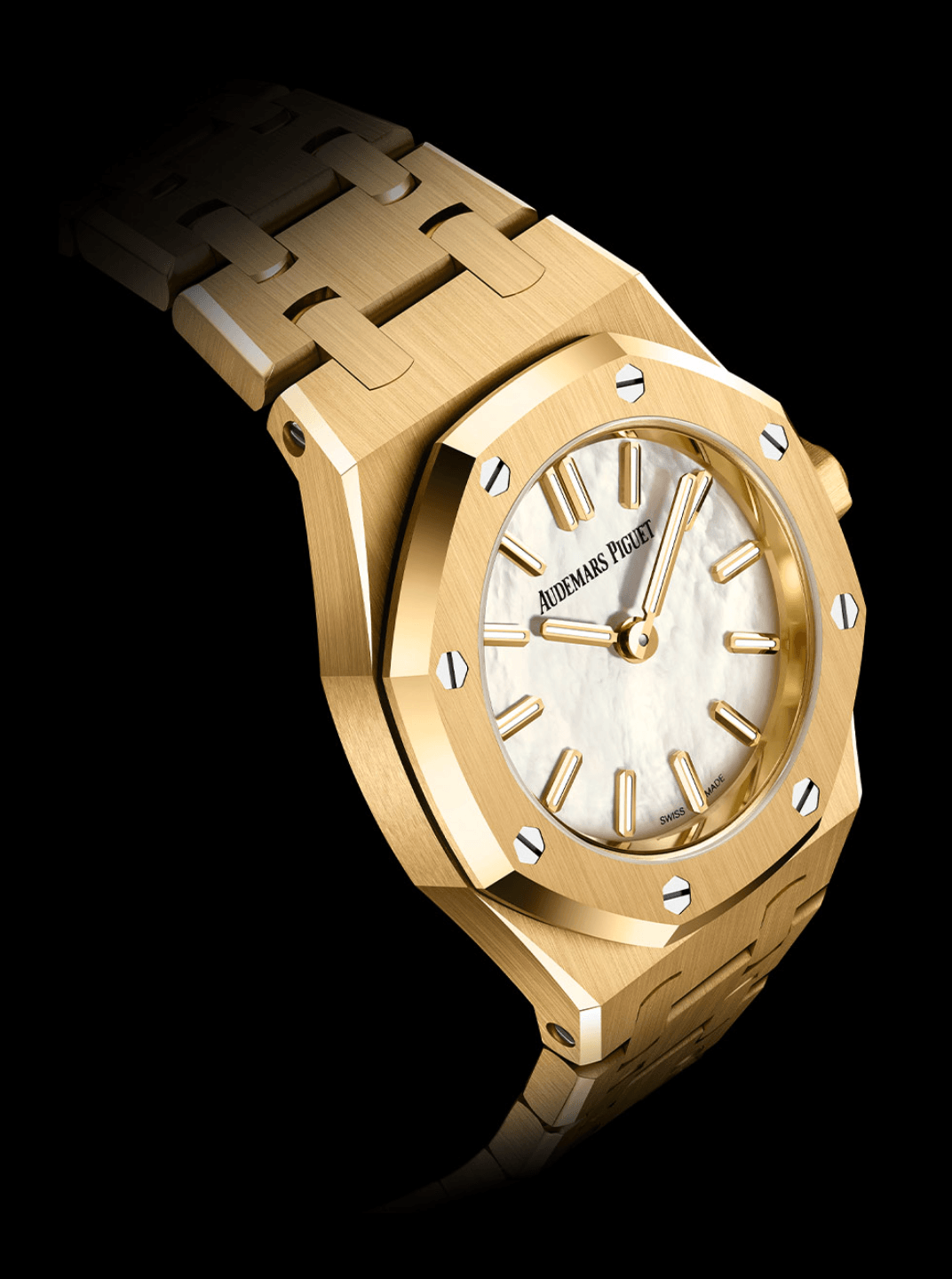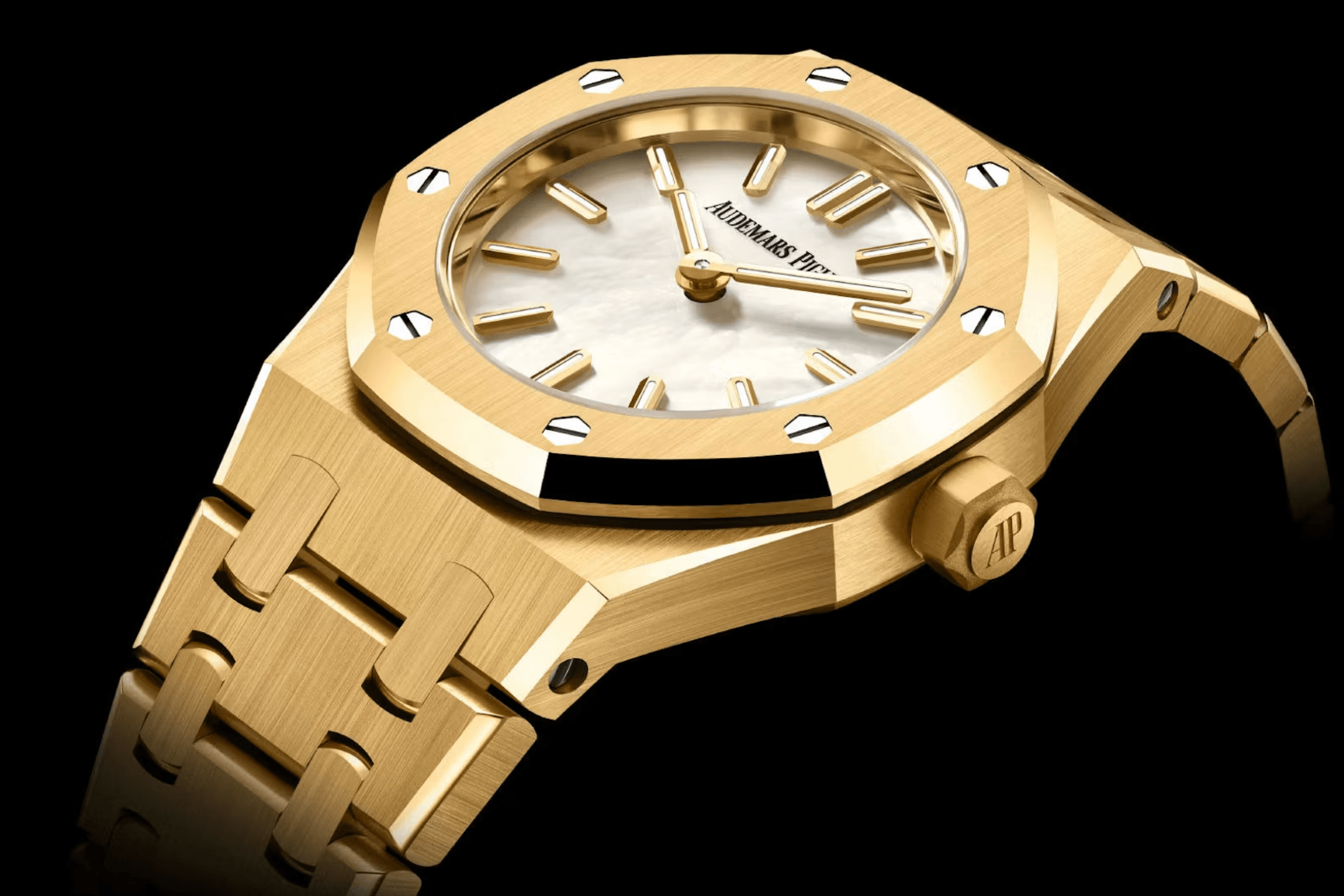 這一代Royal Oak Mini不再沿用早前的Frosted Gold方向,改以石面為主角:黑瑪瑙版本配粉紅金錶殼與錶鏈,珍珠貝母版本則配黃金錶殼與錶鏈,兩者都採用Calibre 2730石英機芯,電池壽命長達94個月。黑瑪瑙的視覺非常鮮明,就像把黑色做到極致的極簡版本,沒有多餘裝飾,再由鑽石時標添加層次;不以花巧取勝,靠材質本身建立存在感,帶來低調奢華感覺。珍珠貝母版本則完全相反,以柔和、光澤與虹彩感帶來輕盈視覺,更具珠寶氣息。貝母面在不同角度下出現細微變化,帶有流動感,這種柔亮效果與Royal Oak Mini的小巧比例非常相襯,令整枚錶看起來更精緻,也更女性化。在現代市場中,23毫米的Royal Oak並不只是縮小版,它把運動錶濃縮成珠寶化配飾,在日常佩戴中呈現個性。