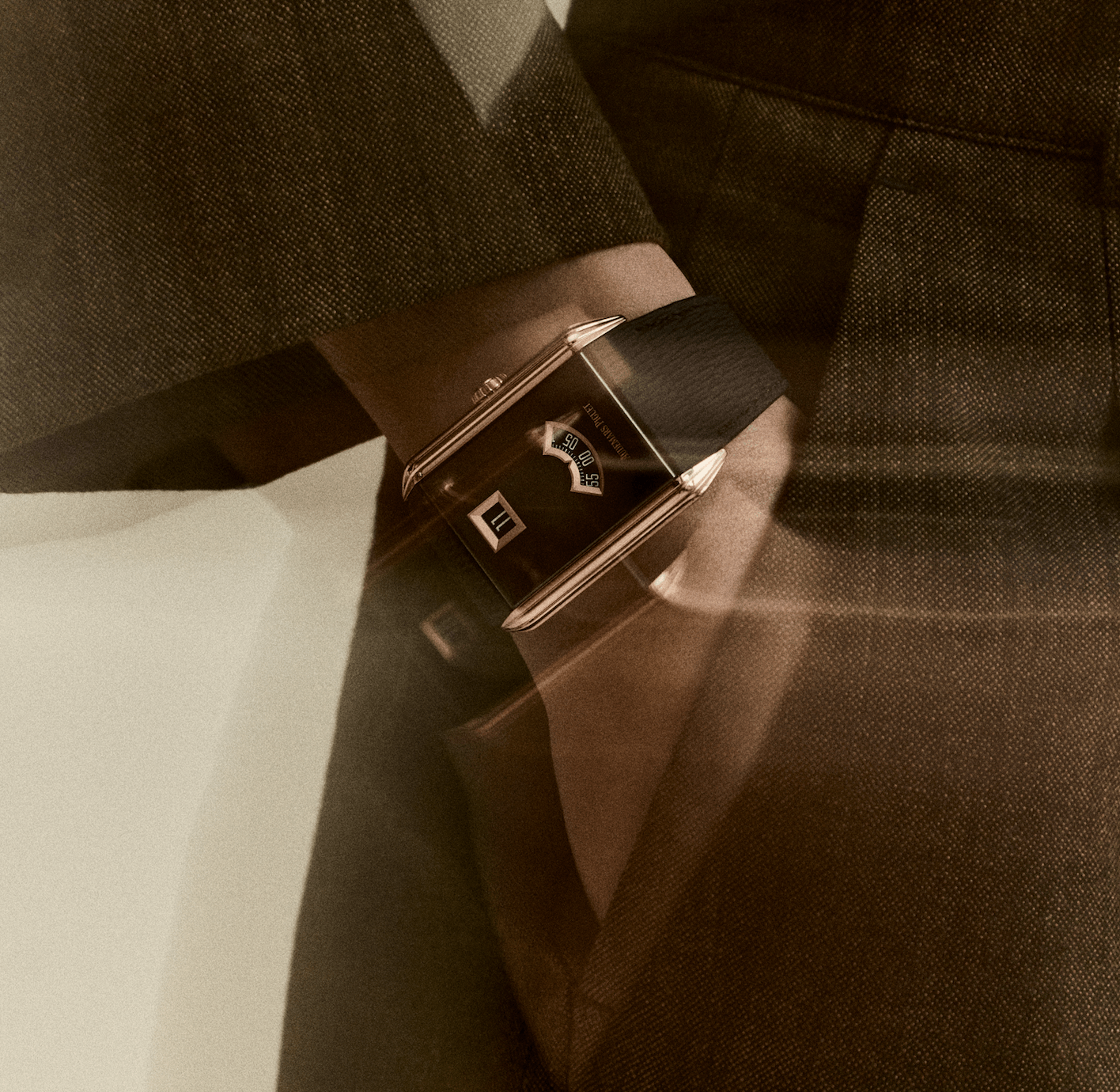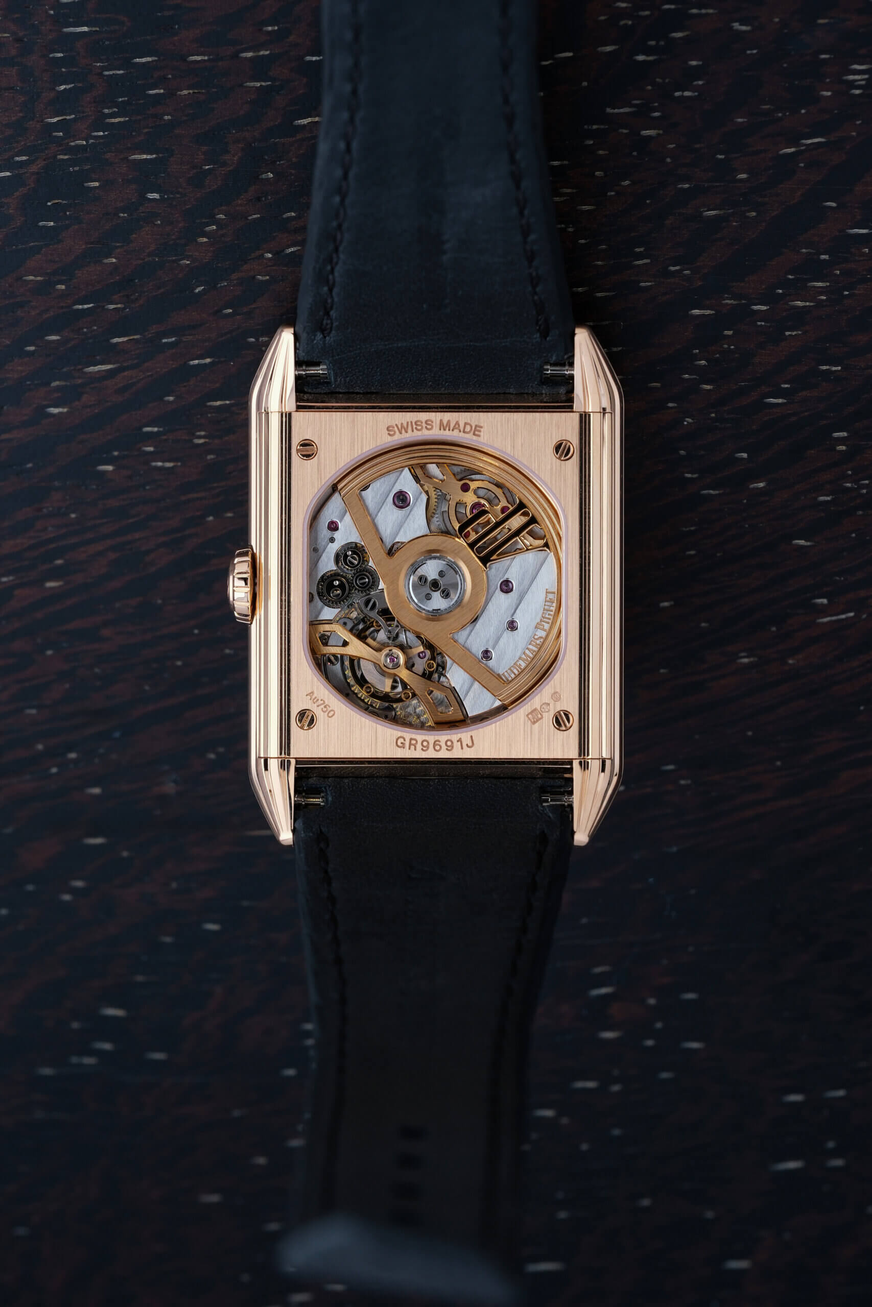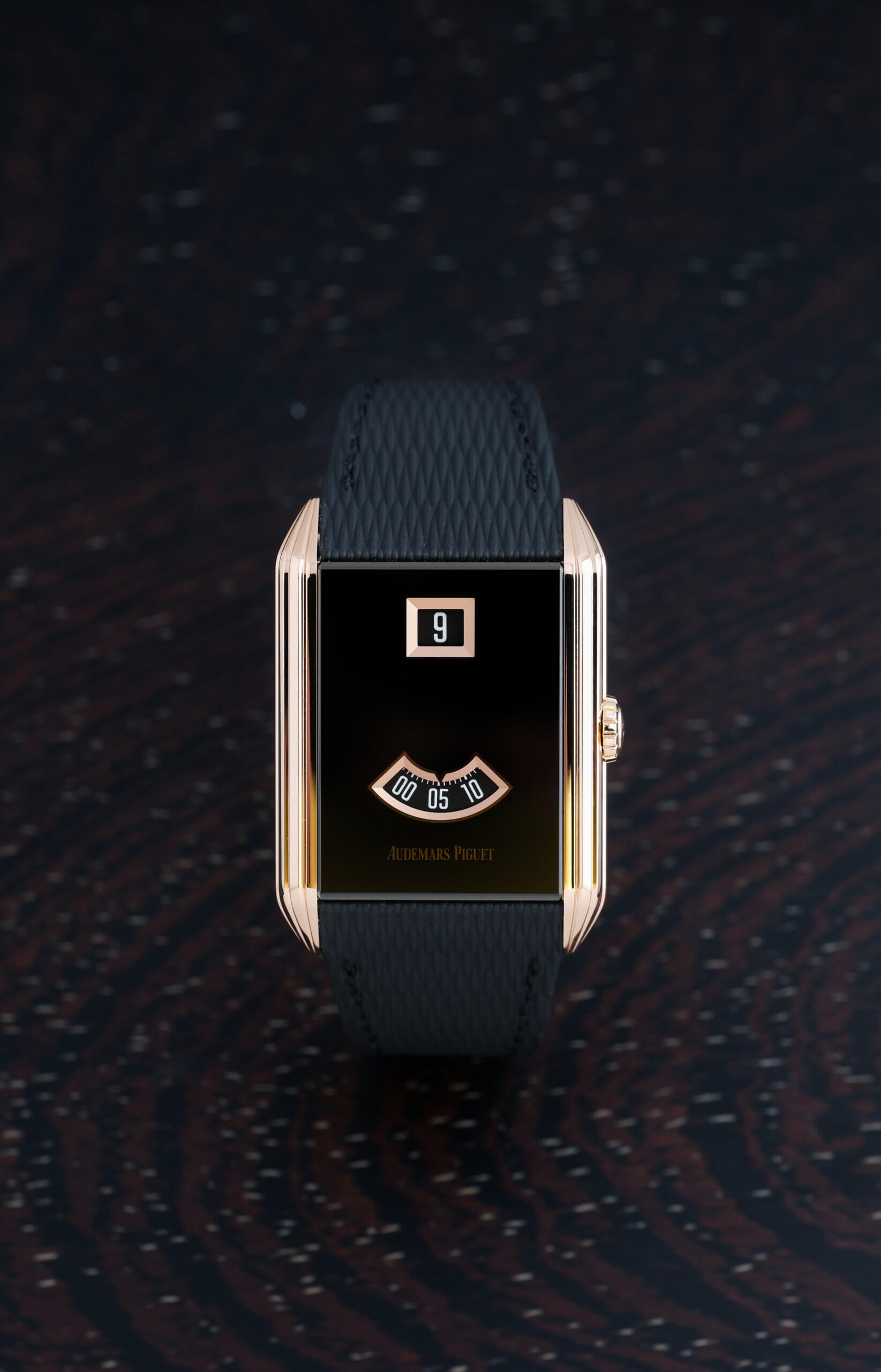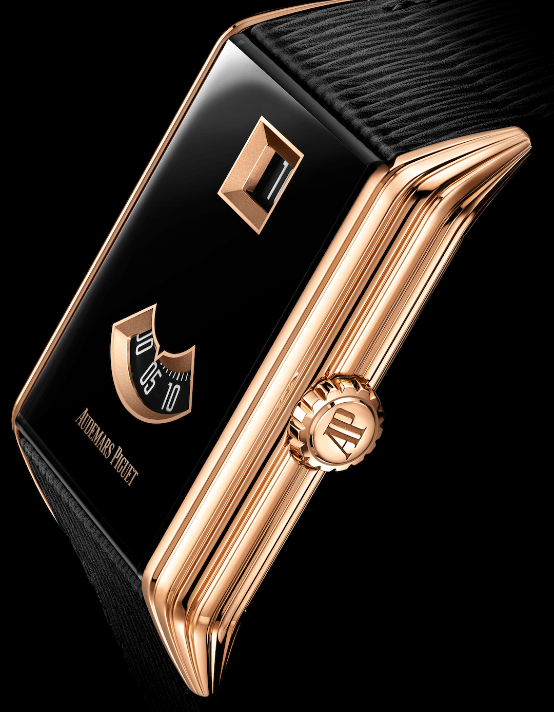 新作採用24.6毫米 × 34毫米矩形18K玫瑰金錶殼,兩側飾以8道縱向凹槽,呼應1929年原型錶款的Paquebot流線風格,線條俐落之餘又保留柔和弧度,令整體不會過於剛硬。與傳統跳時腕錶不同,此復刻作採用經黑色PVD處理的藍寶石錶鏡取代金屬錶盤,並研發專屬工藝,將藍寶石錶盤與基板精準結合,達至20米防水效能。