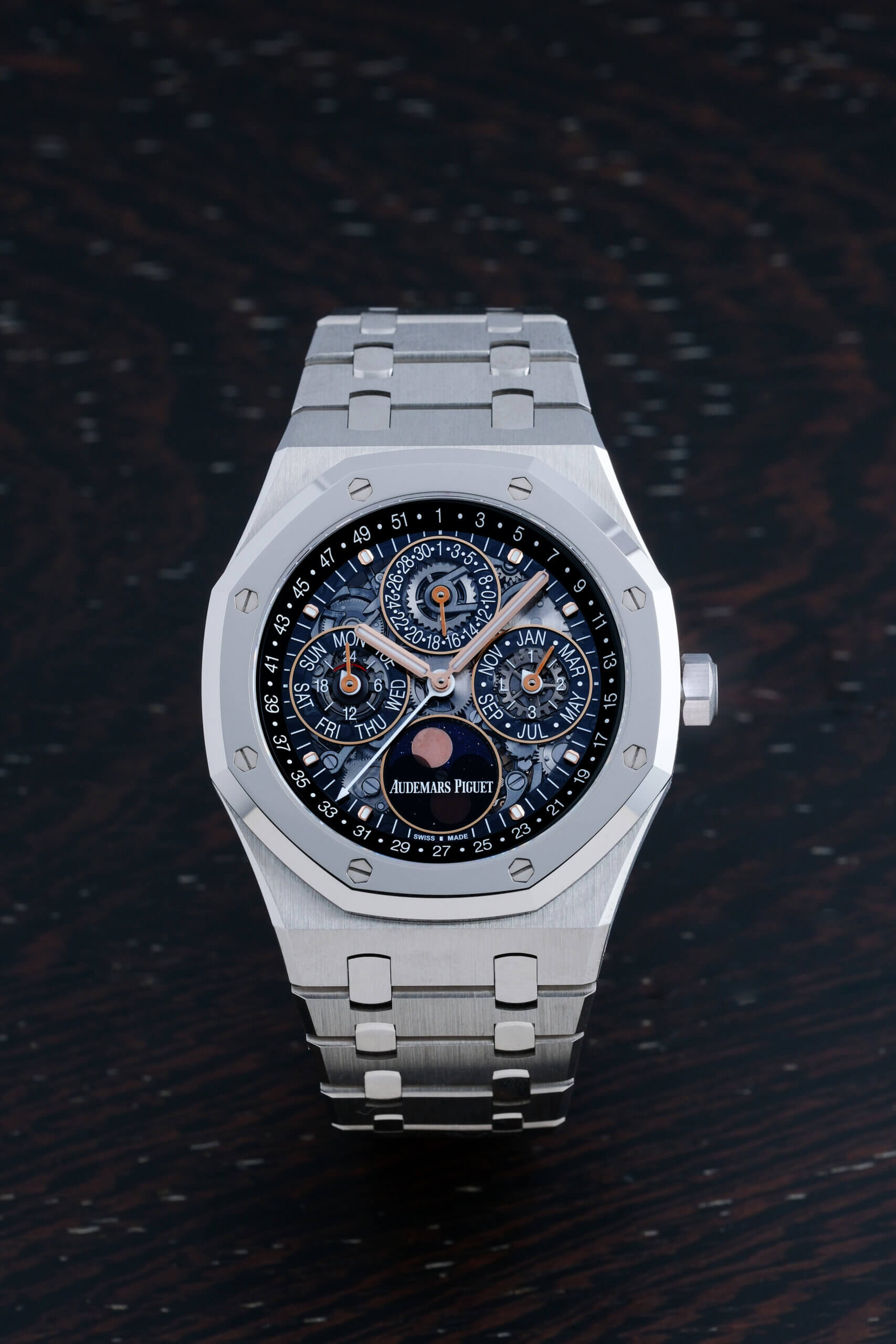 來到2026年,AP Social Club的焦點依然非常清晰:不只是推出一兩枚主打作品,而是以一整組新作展示品牌在設計、複雜功能、天然石材與尺寸比例上的多線發展。今年重點作橫跨Neo Frame Jumping Hour、Royal Oak與Code 11.59的鏤空萬年曆、孔雀石面Royal Oak,以及Royal Oak Mini的黑瑪瑙與珍珠貝母版本等,組成一場層次豐富的發佈。Audemars Piguet不單靠複雜功能說服市場,而是同時以復古語彙、機械性能、天然材質與精緻比例,證明品牌仍然有能力在經典框架內持續創新。