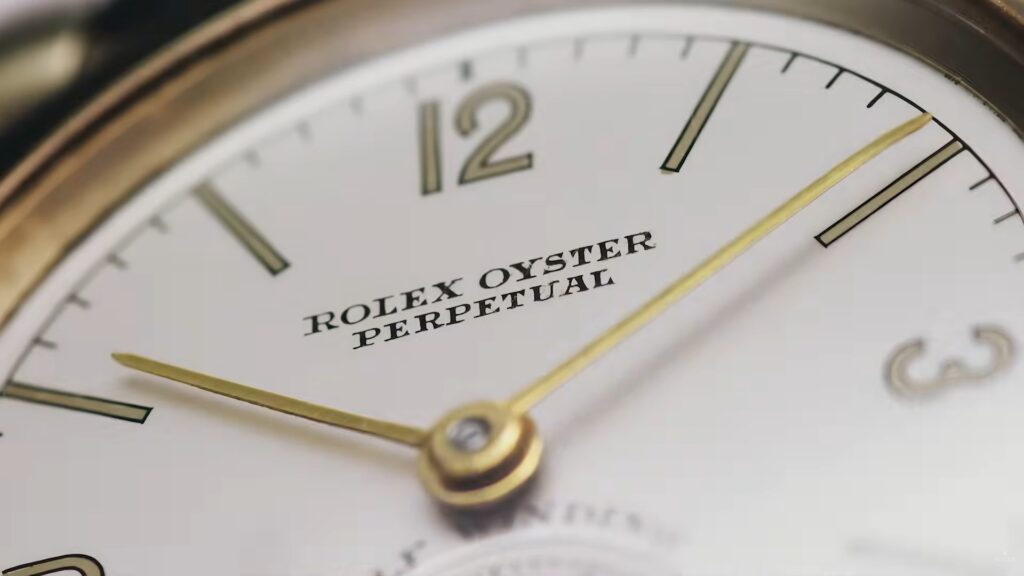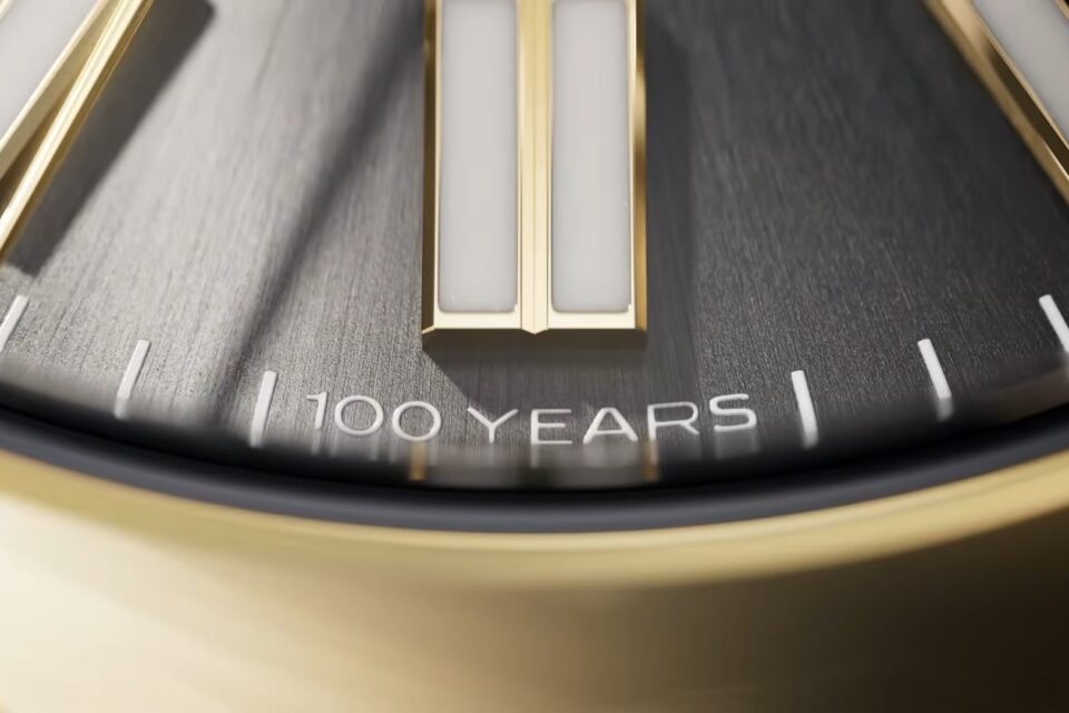 跟著便輪到Daytona、Day-Date、Datejust等現代蠔式腕錶,以快鏡的方式在畫面中閃過。而最重要的新作外形,便在此時曝光!可以看到平常6點鐘下面位置的「SWISS MADE」字樣,被換成極具紀念意義的「100 YEARS」!錶面則是用上太陽光線效果的石板灰色,再配搭金色指針,而白色長條形刻度則加上金色包圍,刻度末端還像114300那一代的OP一樣,加入綠色標記,最後則看到圓拱形黃金外圈。由於只看到腕錶的下半部份,所以很難確定是全新型號?還是Datejust的紀念版,甚至是OP重新推出的黃金型號?一切唯有等待4月14日才知道答案。