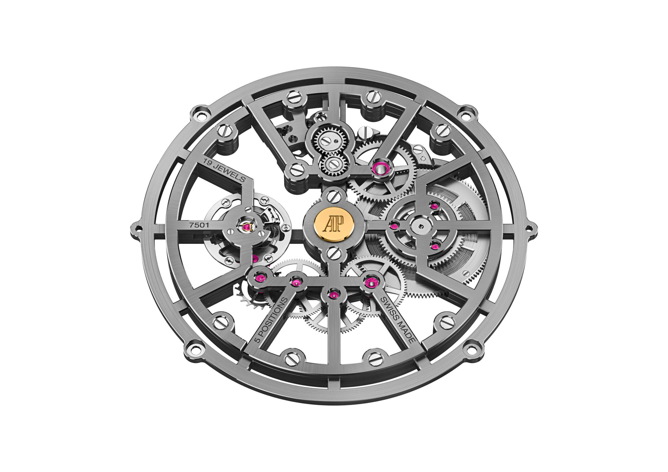 第二款Nomade Établisseurs既可作口懷錶,也能作小型座鐘。作品結合鈦金屬或金屬外殼與天然寶石,並具備收合、打開與擺鐘三種模式。其 7501手上鏈機芯源自7121超薄機芯,經鏤空雕琢後展現透明結構,以橋板作時標,並飾有手工倒角與拋光。