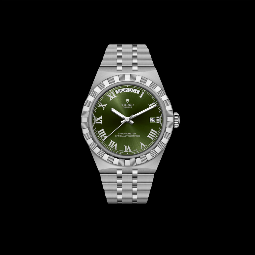 幸好,40毫米的Royal也新增了綠色錶面型號,只要在光線折射下,立即呈現一種淡雅的橄欖綠色,既特別又似曾相識!內涵方面,帝舵除一口氣為整個Royal系列換上自家機芯,更一律通過COSC天文台認證。不單止大大增強機芯精確度,同時在錶面上的「CHRONOMETER OFFICIALLY CERTIFIED」標記,也令整體視覺佈局更平均,擺脫上一代的空洞感覺。配搭現在大熱的一體式錶帶,加上磨光與磨砂的間隔效果處理,佩戴時觸感舒適,亦顯露品牌工藝,而T-fit帶扣則方便日常使用,40毫米售價NTD111,000。
