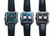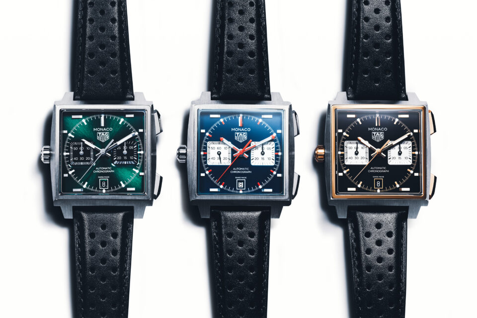 先說全新的Monaco左冠計時腕錶,第一眼給我的感覺,是熟悉卻更銳利。39mm錶殼改用5級鈦金屬製作,而側邊略帶弧度的處理,向邊緣延伸出弧形曲線,以及錶背中央微微隆起的圓形結構,讓佩戴時更服貼。錶盤則變得更耐看,字體閱讀性更直觀,同時透過不同形狀的立體時標與對比強烈的小錶盤,堆疊出更有層次的視覺效果。三款配色中,在這個腕錶無綠不歡的年代,我個人最有感的還是賽車綠。至於經典藍則讓人想起Steve McQueen在電影《Le Mans》佩戴的那只Monaco,而曜金黑則把現代奢華實變成一種風格。