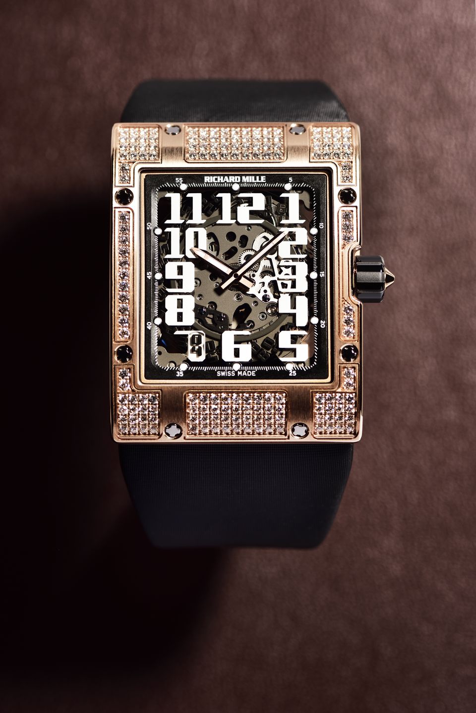 RM 016是RICHARD MILLE產品陣容中首款最具獨特性的腕錶。擁有特別貼合手腕的曲線和錐度設計,錶殼的設計依舊保持了原有特性、追求細節的精神。每一枚錶殼的生產,僅錶殼三大件(錶圈、錶環及錶殼底蓋)就必須歷經大量加工工序。在投入生產前,僅儀器調節就需要18天以上,技術研究和圖紙另須耗時400小時以上。每一枚錶殼均須歷經202道獨立的加工工序。一道道精細工藝近乎嚴苛。例如不再使用外圈,而是用4顆鈦合金螺絲把機芯固定安裝在底架的固定橡膠(ISO SW)上。凡此種種,盡顯精妙絕倫。三件體錶殼以三個丁晴O形密封圈保證30米防水性能。錶殼乃採用12顆5級鈦合金花鍵螺絲及抗磨損銅-鎳-鋅合金墊圈組裝而成。這只紅金鑲鑽的RM 016內部搭載的RMAS7鏤空自動上鍊機芯具有可變幾何的自動盤,這個設計可使自動盤的慣性隨著最細微的胳膊及手部運動改變上鍊速度,緩慢動作令速度增加,於劇烈運動時則減速。最能配合佩戴者各種多采多姿的生活方式,絕對是最適合日常佩戴的頂尖腕錶。