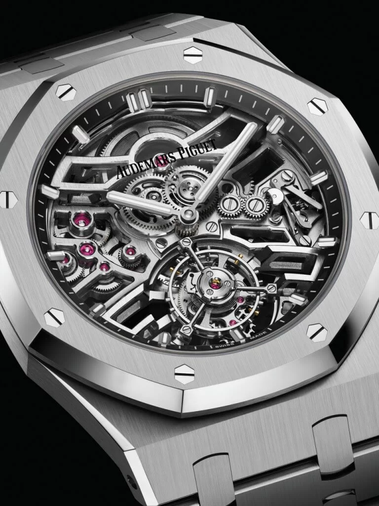 Royal Oak系列慶祝50周年咁大件事,當然要有一兩枚具複雜功能的大作為壓軸,這枚皇家橡樹系列鏤空飛行陀飛輪自動腕錶,是愛彼品牌有史以來第一款同類作品,當然就是為了祝賀皇家橡樹系列50周年而特別創作。