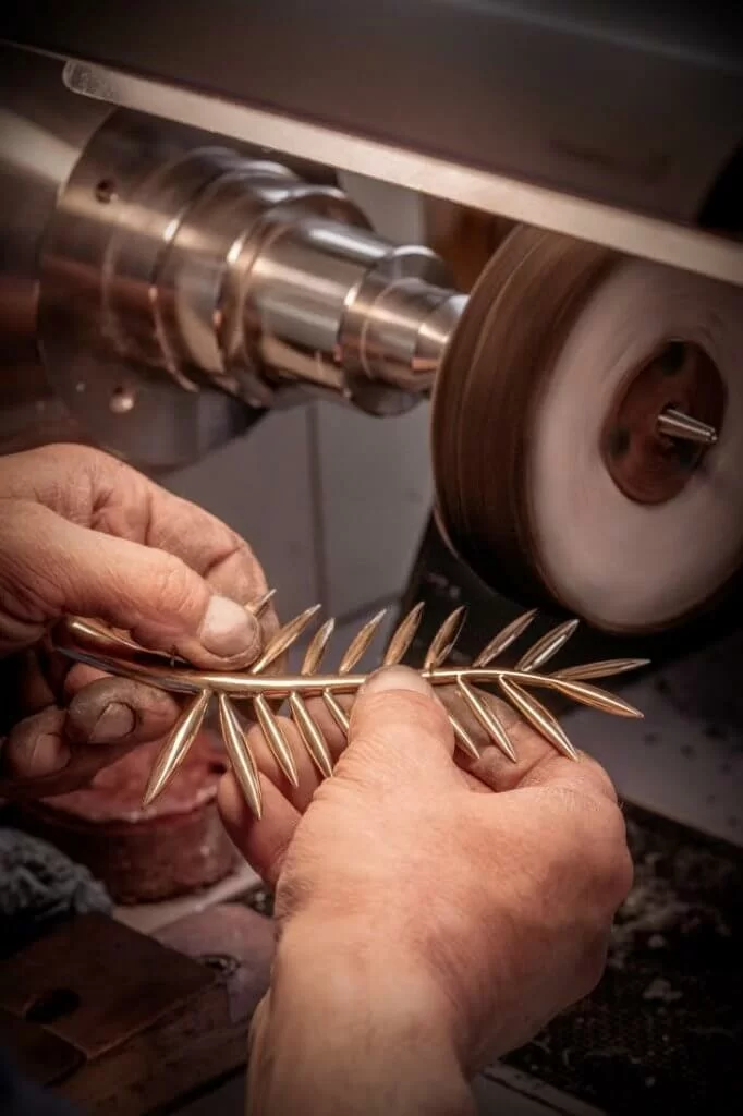 在棕櫚樹的兩塊葉片上點綴採購自責任珠寶委員會(Responsible Jewellery Council)認證供應商的璀璨鑽石。其中一塊葉片上鑲嵌75顆鑽石以呼應第75屆康城電影節,而另一塊葉片上則鑲嵌25顆鑽石,見證蕭邦擔任電影節合作夥伴25年來所作出的積極努力,由此共慶此「雙周年」紀念。