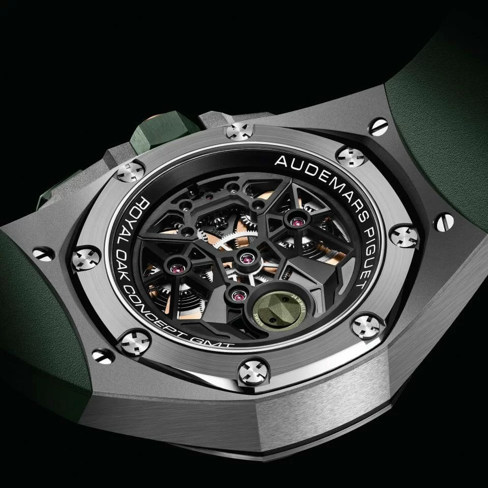 本月一眾錶迷必到的 Audemars Piguet 50周年展覽,你又去咗未?今個月品牌尚有無窮驚喜新品推出,剛剛就推出全新Royal Oak Concept皇家橡樹概念系列飛行陀飛輪GMT腕錶,是次更以今年大熱的墨綠色為錶殼色調。這款複雜功能腕錶的鈦金屬錶殼首次搭配綠色陶瓷錶圈,打造出更具當代風格的耀眼身影。從錶面及透過藍寶石水晶玻璃底蓋, 皆可玩味宛如當代建築的黑色機芯,綠色 CVD塗層裝飾元素與錶圈同色,並與黑色部分形成強烈對比,進一步烘托腕錶的高科技氣息。