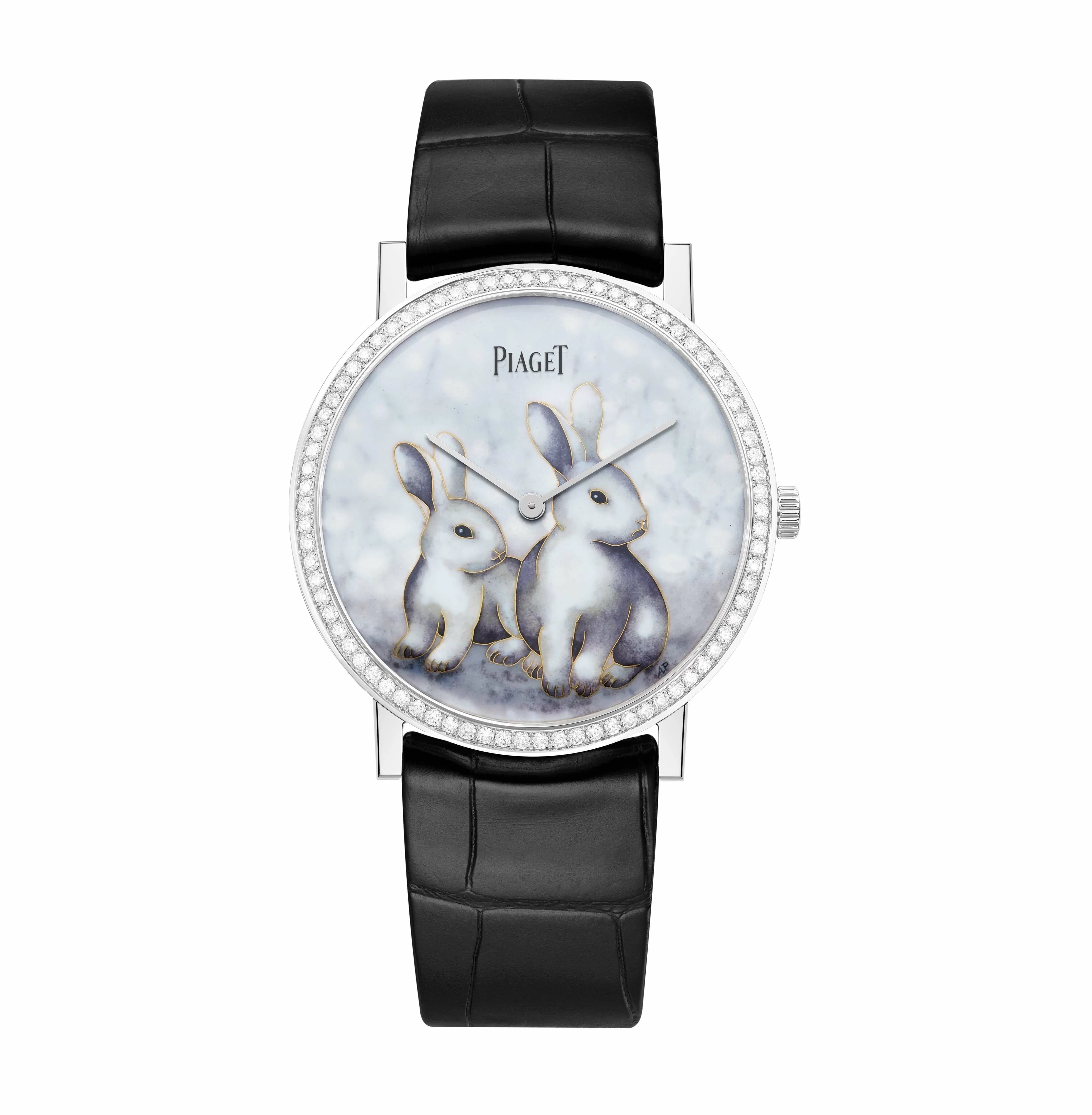 這款限量發售38枚的Altiplano腕錶,飾有兩隻發光的兔子, 搭配直徑38毫米且鑲嵌78顆明亮式圓形切割鑽石(約0.71克拉)的18K白金錶殼。 搭載430P超薄機芯,並配備黑色鱷魚皮錶帶, 僅限於伯爵專賣店出售。