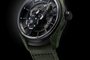 錶殼側面所採用的創新材質此前曾亮相於FREAK X奇想岩漿腕錶中,但不同於前作中碳纖維與紅色大理石紋環氧樹脂的激盪碰撞,新作呈現出碳纖維與綠色環氧樹脂的迷人交織。