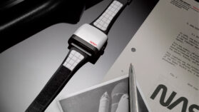 錶盤還經過拋光處理,以增添光澤。玫瑰金時標及螢光塗層梯形指針進一步拓展了色彩層次,灰色內錶圈則與橡膠塗層錶圈、馬賽克橡膠錶帶和諧呼應。