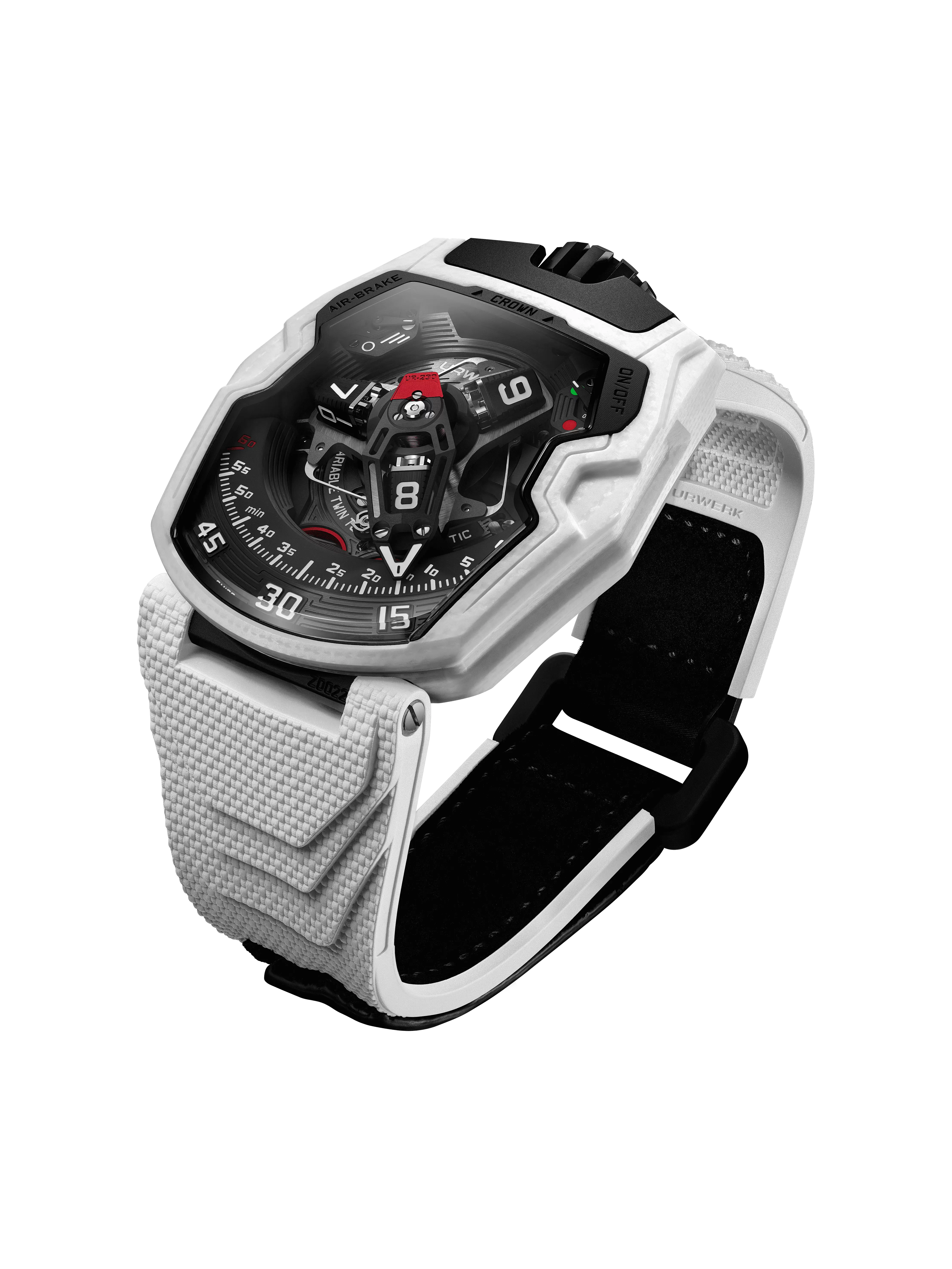 腕錶的白色錶殼是由層狀陶瓷基複合材料製成,其聚合物基底由陶瓷片與玻璃纖維交織,當中還有另一特色,包覆纖維陶瓷物料的樹脂是白色,玻璃纖維是淺銀色。將錶殼切割成複雜的形狀,會見到精細的迭層,隨錶殼曲線及角度產生不同效果,從全啞色到微亮,綻放不規則光感。這銀白色像有生命的不斷微妙變化,與近乎全黑的 UR-7.30機芯形成強烈對比。